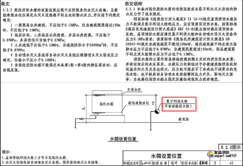 5.2.2 高位消防水箱的設置位置應高于其所服務的水滅火設施,且最低有效水位應滿足水滅火設施最不利點處的靜水壓力,并應按下列規定確定: